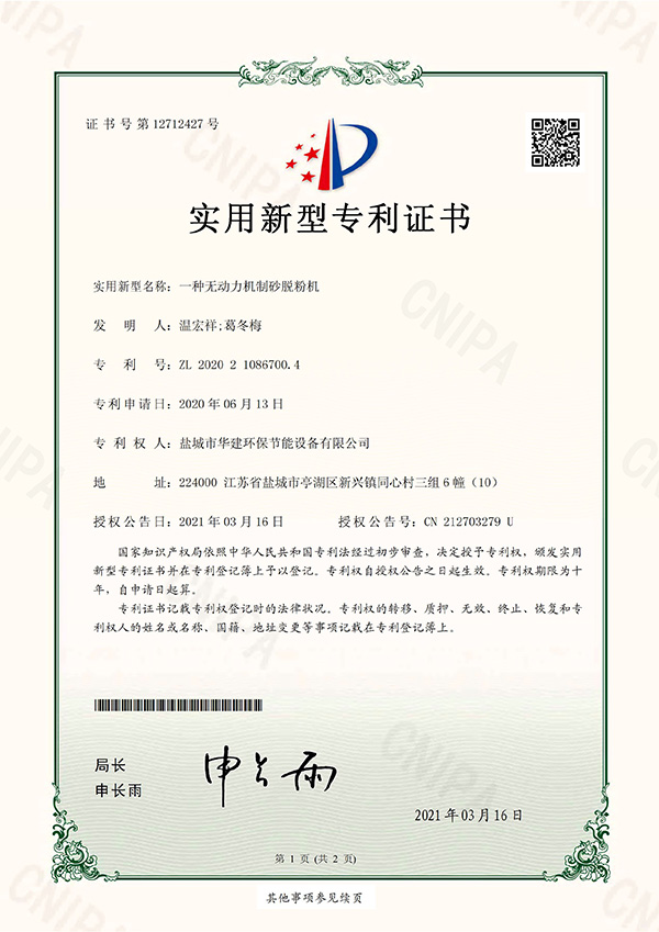一種無(wú)動(dòng)力機(jī)制砂脫粉機(jī)-實(shí)用新型專(zhuān)利證書(shū)